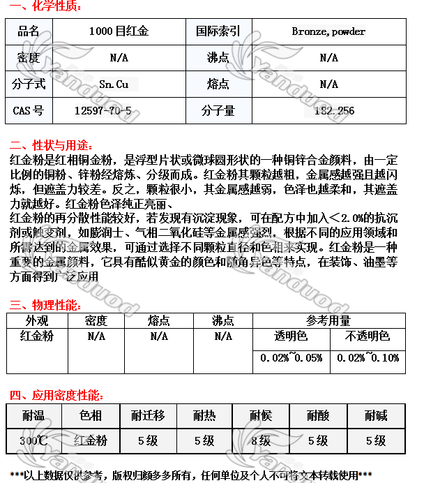商品属性 [编码] 5204 [规格] 25公斤/桶 [耐温度] 300度 [色相] 红金 [产地] 中国 [生产商] 国产