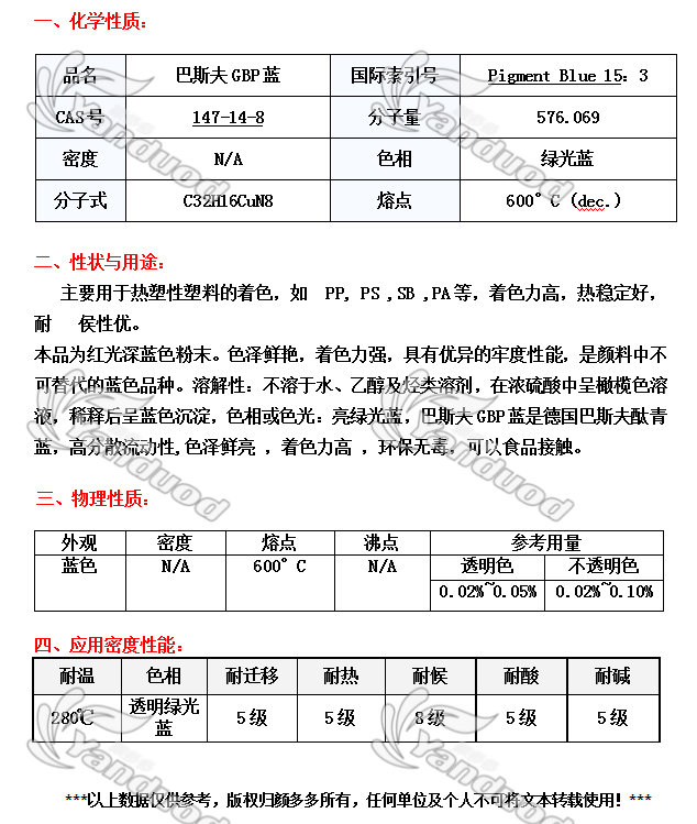 有机颜料 [编码] 4105 [生产商] 巴斯夫 [索引号] PigmentBlue15:3 [规格] 10公斤/包 [耐温度] 300度 [色相] 绿光蓝 [产地] 德国