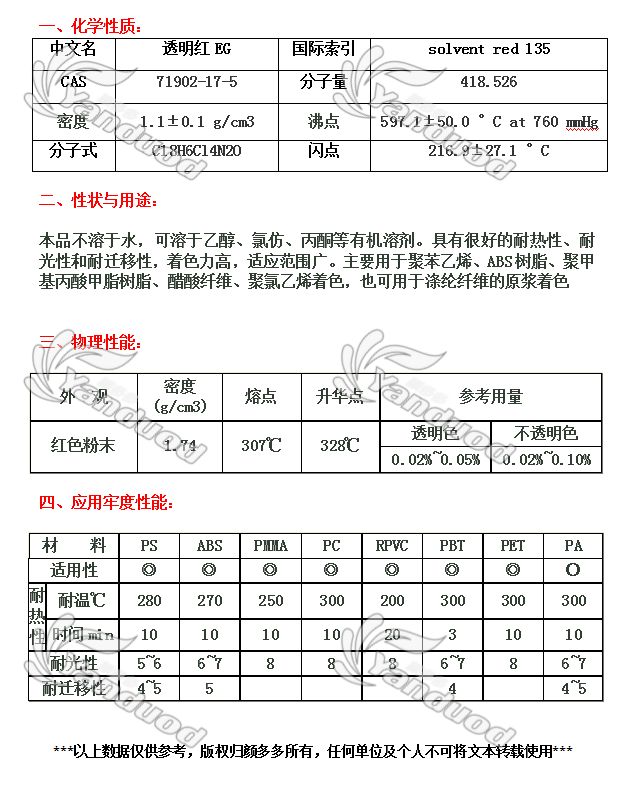 溶剂染料 [编码] 1105A [生产商] 南通龙翔 [索引号] solvent red 135 [规格] 25公斤/包 [耐温度] 280度 [色相] 黄光红 [产地] 中国