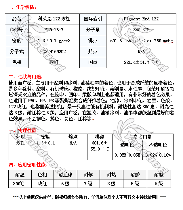 有机颜料 [编码] 3118A [生产商] 科莱恩 [索引号] Pigment Red 122 [规格] 20公斤/包 [耐温度] 300度 [色相] 玫红 [产地] 德国