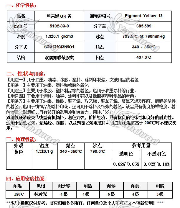 有机颜料 [编码] 3223A [生产商] 科莱恩 [索引号] Pigment Yellow 13 [规格] 25公斤/包 [耐温度] 180度 [色相] 纯光黄 [产地] 德国