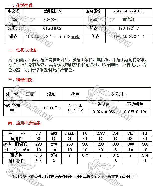 溶剂染料 [编码] 1104 [索引号] 111# [规格] 25公斤/桶 [耐温度] 250度 [色相] 黄光艳红 [产地] 中国 [生产商] 江苏亚邦