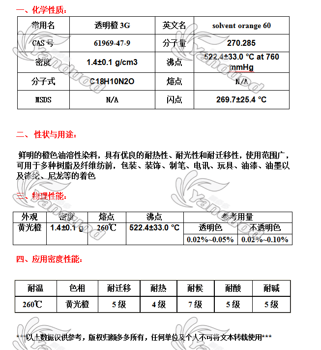 溶剂染料 [编码] 1501 [生产商] 国产 [索引号] 60# [耐温度] 260度 [色相] 黄光橙 [产地] 中国 [规格] 20公斤/桶