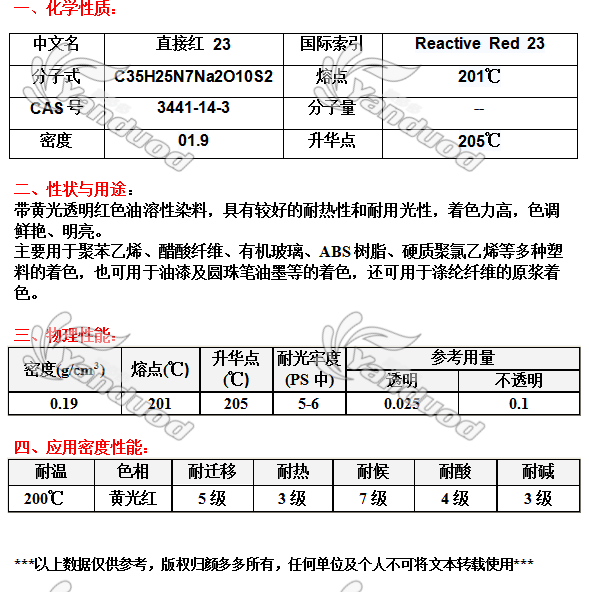 溶剂染料 [编码] 1101A [索引号] 23# [规格] 20公斤/包 [耐温度] 220度 [色相] 黄光红 [产地] 中国 [生产商] 江苏亚邦