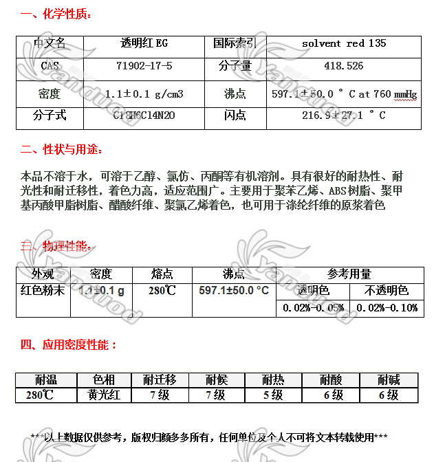 溶剂染料 [编码] 1105B [生产商] 马来赛旸 [索引号] 135# [规格] 10公斤/包 [耐温度] 250度 [色相] 黄光红 [产地] 马来西亚