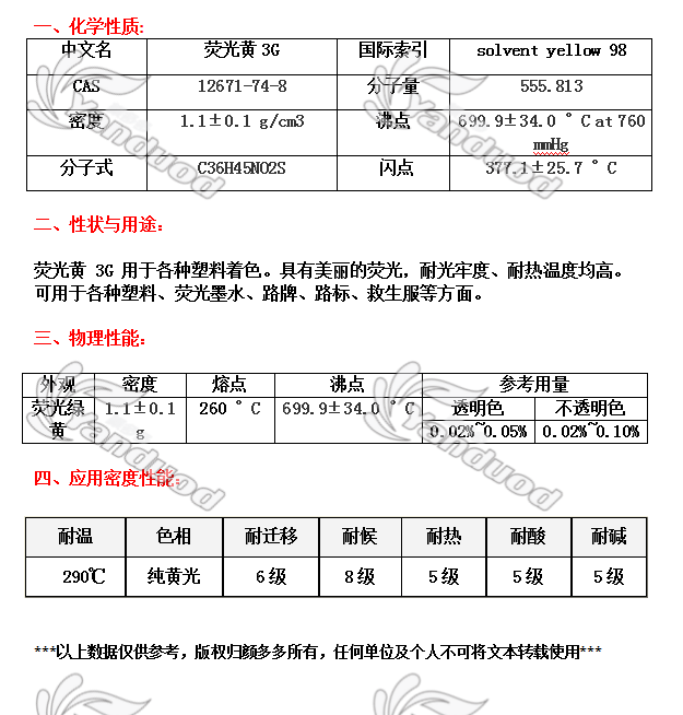 溶剂染料 [编码] 1304 [索引号] 98# [规格] 25公斤/桶 [耐温度] 290度 [色相] 荧光绿黄 [产地] 中国 [生产商] 江苏亚邦